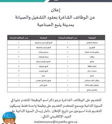 الهيئة الملكية في #ينبع 33 ظيفة على عقود التشغيل والصيانة فنيين وسائقين وعمال وإخرى