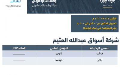 اسواق عبدالله العثيم وظائف كاشير وبائعين في الرياض