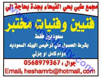 وظائف في جدة موظفين استقبال في شقق مفروشة وموظفين وموظفات استقبال في مستوصف طبي وفيين وفنيات مختبر