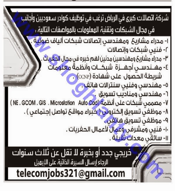 وظائف مدراء مشاريع ومهندسين اتصالات وفنيي شبكات واتصالات ومهندسين اجهزة وسنترالات ومناديب تسويق ووظائف إخرى