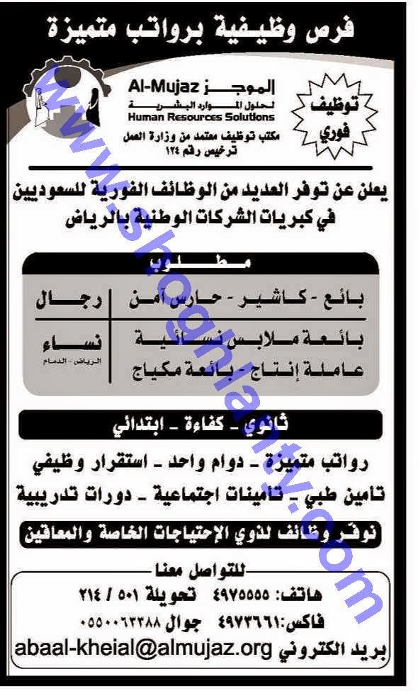 ووظائف نسائية في الرياض 1435 بائعة ملابس نسائية وعاملة انتاج وبائعة مكياج
