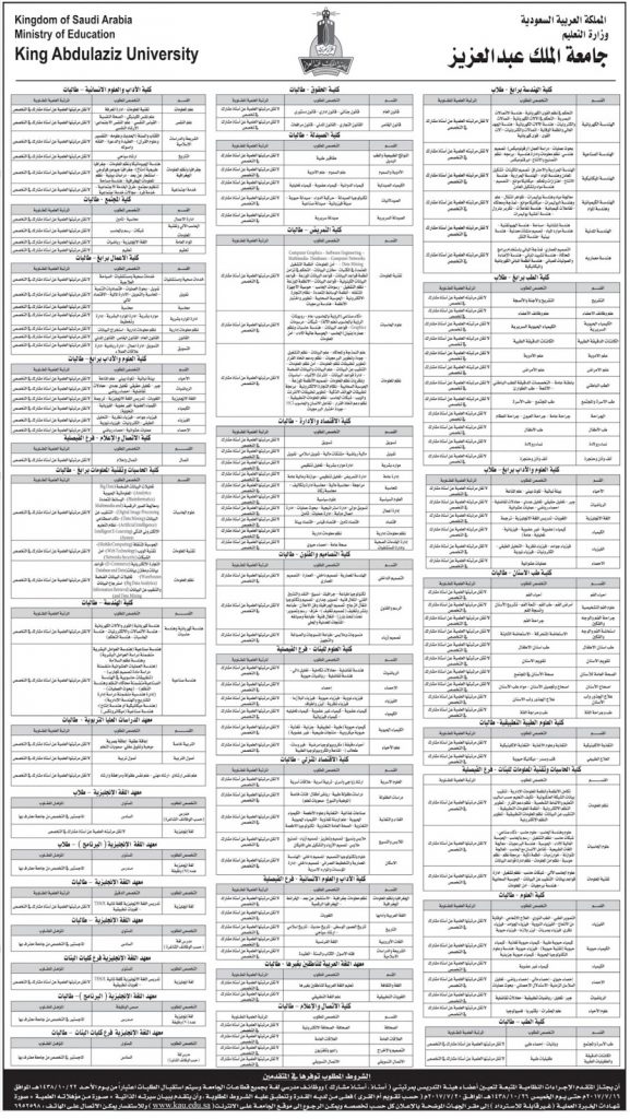 جامعة الملك عبدالعزيز عن توفر وظائف أكاديمية ( للرجال و للنساء) والمشغولة لديها بمتعاقدين بأعضاء هيئة تدريس بمرتبتي (أستاذ ، أستاذ مشارك) ووظائف مدرسي لغة بجميع قطاعات الجامعة للسعوديين والسعوديات ، على أن يتم استقبال الطلبات اعتباراً من يوم الأحد 22 / 10 / 1438هـ الموافق 16 /7 / 2017 م وحتى يوم الخميس 26 / 10 / 1438هـ الموافق 20 / 7 / 2017 م *، علماً بأن التقديم لهذه التخصصات سيكون بمقر الجهات الموضحه بالإعلان المرفق .