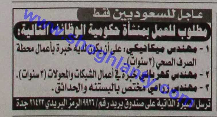 وظائف مهندسين للعمل في منشأة حكومية ميكانيكي وكهربائي وزراعي الغربية جدة