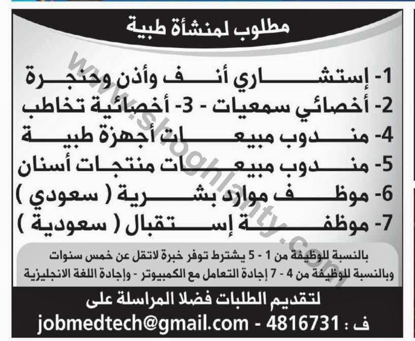 وظائف في منشأة طبية استشاري انف وأذن وحنجرة واخصائي سمعيات واخصائية تخاطب ومندوبي مبيعات وموظف موارد بشرية وموظفة استقبال