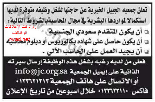 وظيفة محاسبة في الجبيل كما في صورة الاعلان