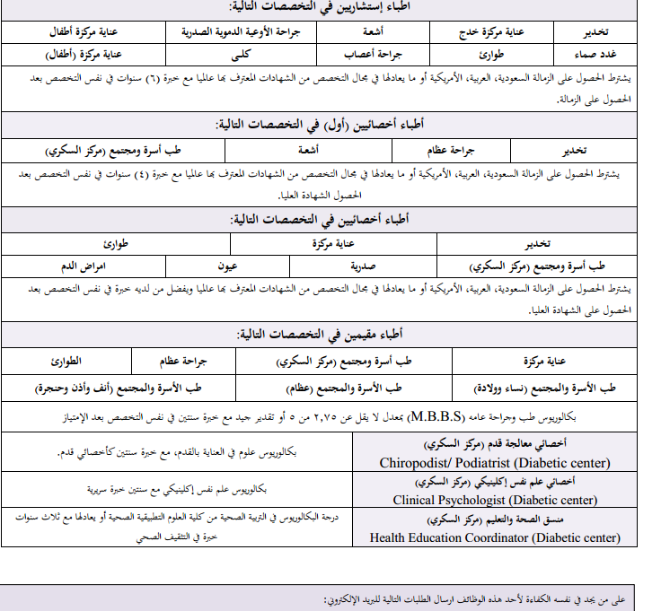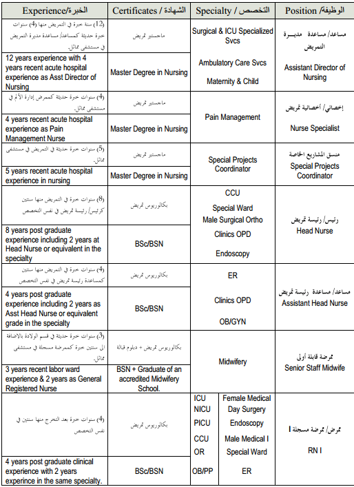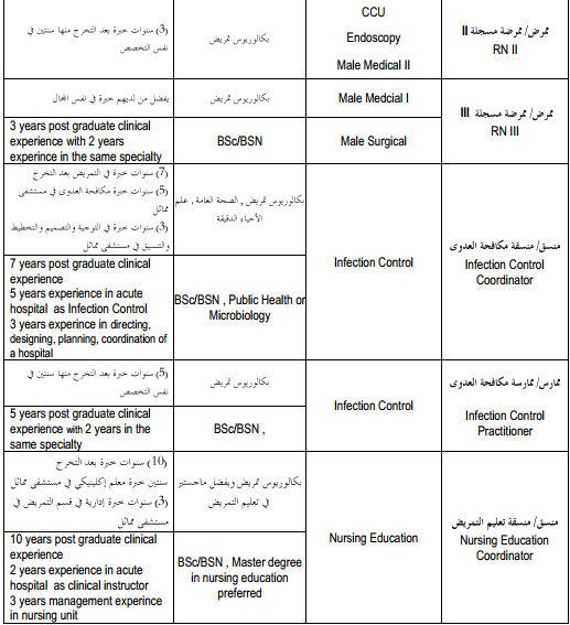 مساعد ومساعدة مديرة التمريض واخصائي واخصائية تمريض ومنسق المشاريع الخاصة