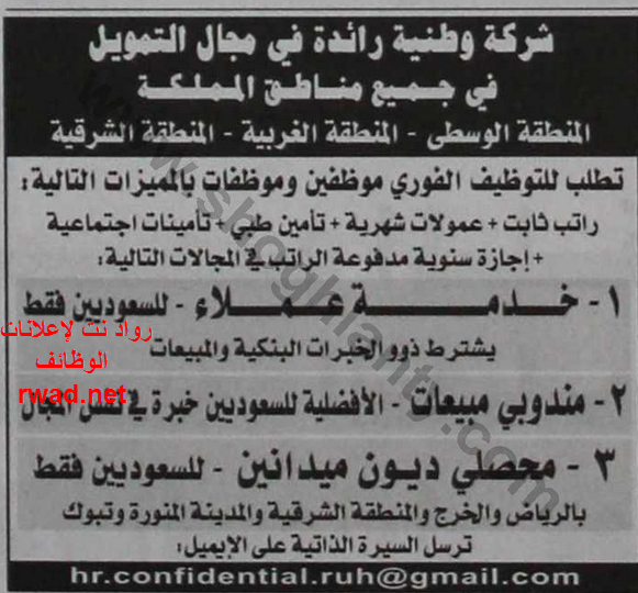 وظائف خدمة عملاء ومندوبي مبيعات ومحصلين في الرياض والخرج والمدينة المنورة وتبوك والشرقية