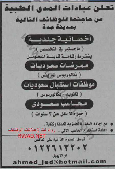 وظائف عيادات في جدة اخصائية جلدية وممرضات سعوديات وموظفات استقبال في جدة ومحاسب سعودي