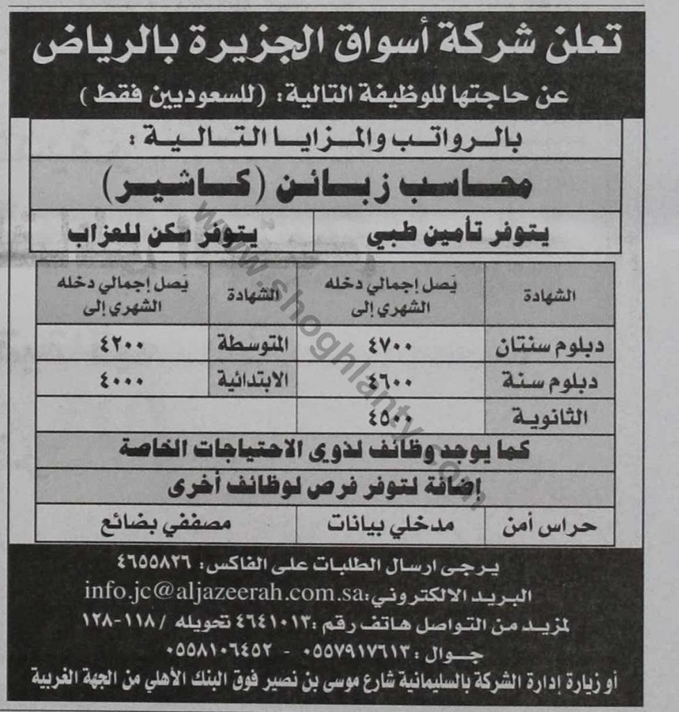 وظائف شركة أسواق الجزيرة محاسب كاشير وحراس امن ومدخلي بيانات ومصففي بضائع الرواتب 4000-4700 ريال