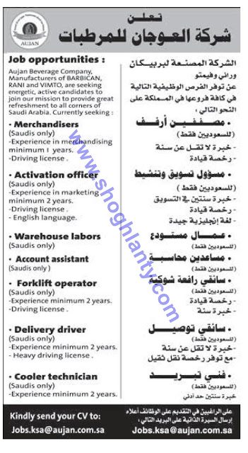 شركة العوجان للمرطبات وظائف مصففي ارفف ومسؤول تسول وعمال مستودع وسائقي رافعه شوكيه وتوصيل