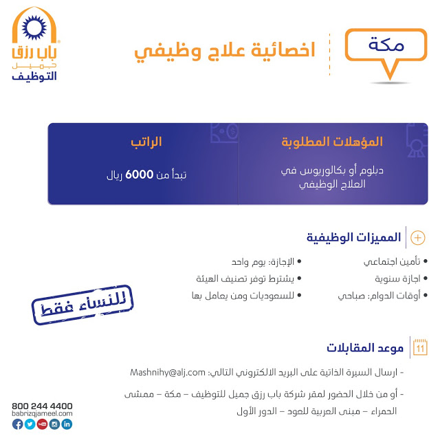 وظائف نسائيه في #مكة مشرفة عناية صحية واخصائيه علاج وظيفي