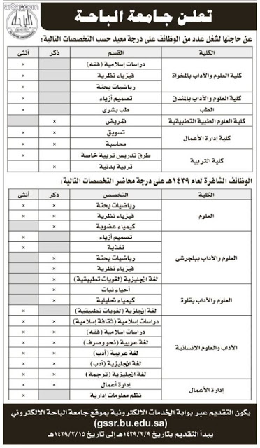 اعلنت جامعة الباحة عن وظائف معيدين ومحاضرين والتقديم يكون من خلال (http://gssr.bu.edu.sa/) وذلك  يوم 9 / 2 / 1439هـ إلى تاريخ 15 / 2 / 1439هـ .