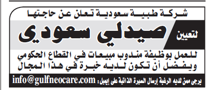 وظيفة صيدلي سعودي للعمل بوظيفه مندوب مبيعات قطاع حكومي في شركه طبيه