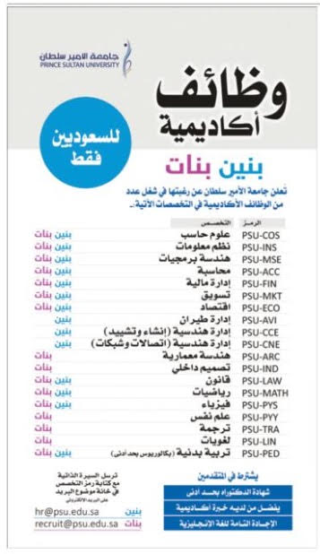 تعلن جامعة الأمير سلطان بالرياض عن رغبتها في شغل وظائف أكاديمية شاغرة في عدد من التخصصات وذلك وفق الشروط التالية