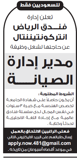 مدير إدارة صيانة في فندق الرياض انتركونتيننتال