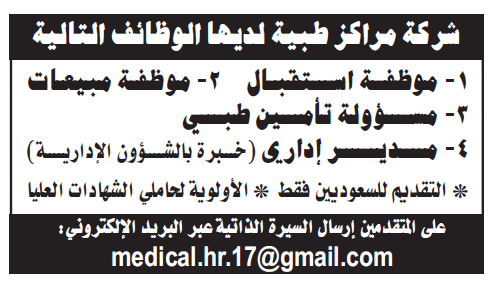 وظائف نسائيه في #الرياض في مراكز طبيه استقبال ومبيعات ومسئولة تأمين ومدير إداري