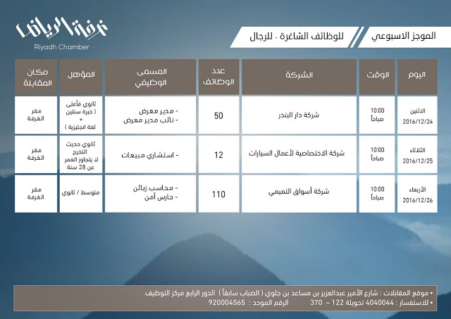 كما سيتم في يوم الثلاثاء 27 ديسمبر إجراء المقابلات الشخصية للشباب الحاصلين على الثانوية لشغل 12 وظيفة بمسمى (استشاري مبيعات) وستكون المقابلات بمقر غرفة الرياض العاشرة صباحًا، ويشرط أن يكون المتقدم حديث التخرج ولا يتجاوز عمره 28 عاماً، فيما سيتم في صباح الأربعاء 28 ديسمبر بمقر الغرفة إجراء المقابلات لشغل 110 وظائف بمسمى (محاسب زبائن ، حارس أمن) وهي مخصصة للحاصلين على الثانوية والمتوسطة.
