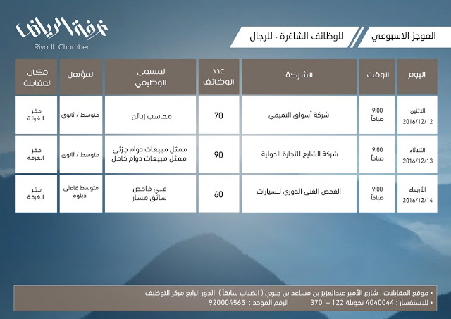 وظيفة في شركة أسواق التميمي، والوظائف تحت مسمى (محاسب زبائن) وستكون المقابلات بمقر غرفة الرياض التاسعة صباحاً. كما سيتم في يوم الثلاثاء 13 ديسمبر إجراء المقابلات الشخصية للشباب الحاصلين على الثانوية والمتوسطة لشغل (90) وظيفة في شركة الشايع الدولية للتجارة، والوظائف تحت مسمي (ممثل مبيعات – دوام جزئي، ممثل مبيعات – دوام كامل) وستكون المقابلات لشغل هذه الوظائف بمقر غرفة الرياض التاسعة صباحاً. وفي الاربعاء 14 ديسمبر ستجري المقابلات الشخصية للشباب الحاصلين على الدبلوم والمتوسط وما فوق لشغل (60) وظيفة في الفحص الفني الدوري للسيارات، والوظائف تحت مسمي (فنى فحص، سائق مسار) وستكون المقابلات لشغل هذه الوظائف بمقر غرفة الرياض التاسعة صباحاً.