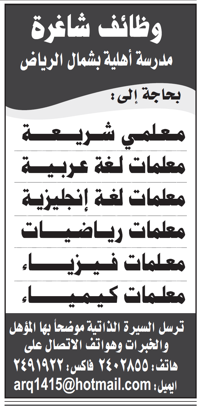 وظائف معلمين ومعلمات عربي انجليزي رياضيات فيزياء كيمياء في شمال #الرياض