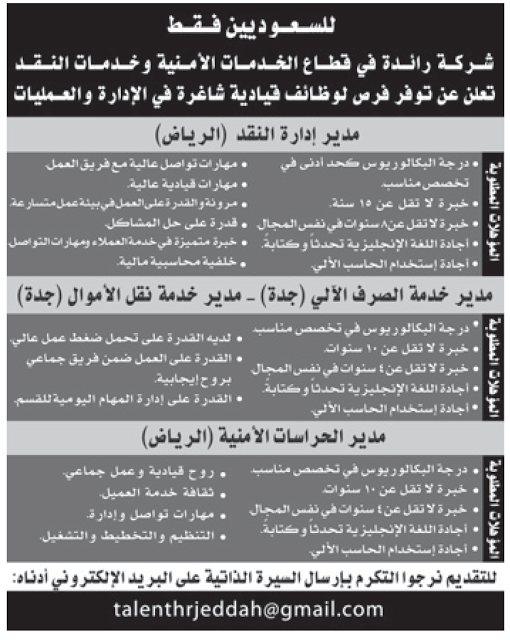 وظائف خدمات امنية ونقد مدير إدارة نقد وصراف آلي وحراسات في #جدة #الرياض