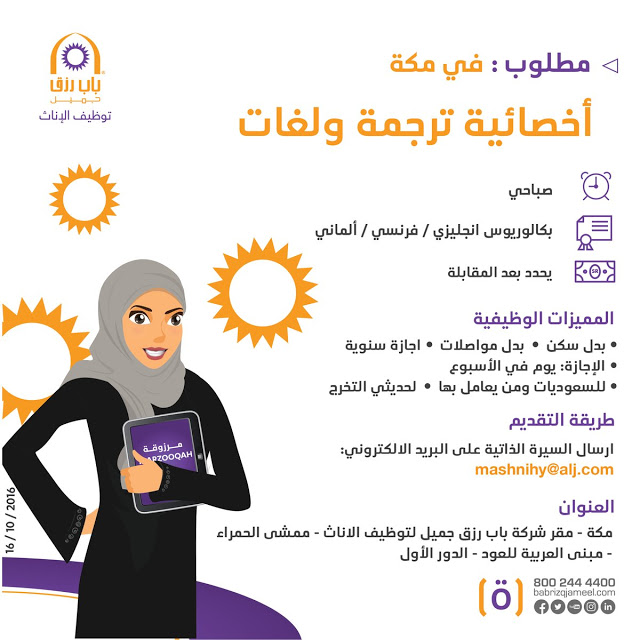 17/10/2016 | أحدث الوظائف اليوم، وظائف مكة المكرمة، وظائف نسائية