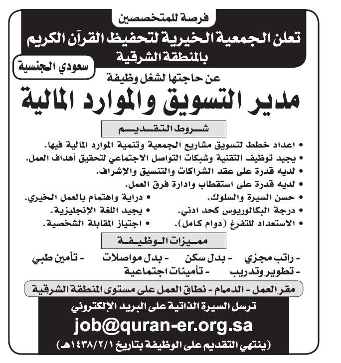 الجمعية الخيرية لتحفيظ القرآن الكريم في الشرقية مدير تسويق موارد مالية