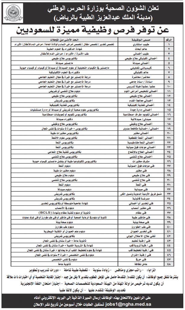 مدينة الملك عبدالعزيز الطبية وظائف طبيه واخصائيه وفنيين