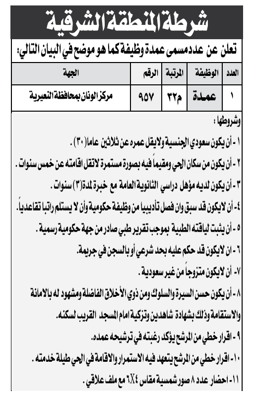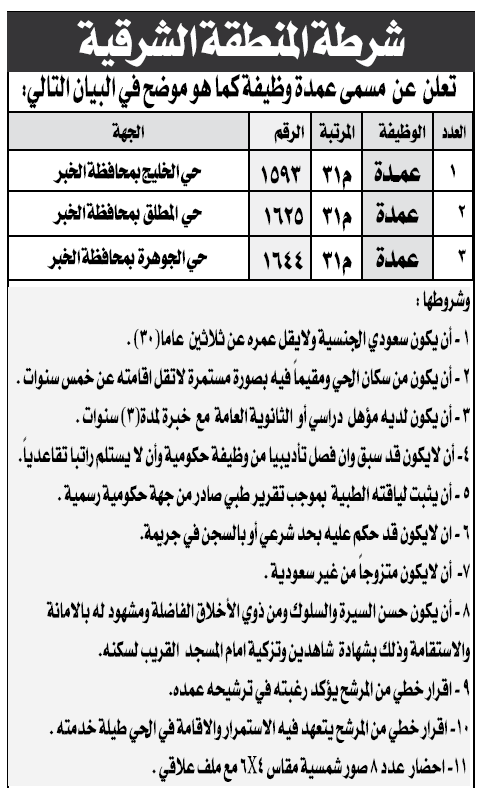وظائف عمدة في الشرقية #الخبر و #النعيرية