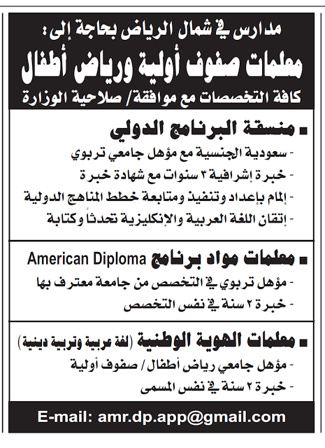 وظائف معلمات في شمال #الرياض صفوف اولية ورياض اطفال
