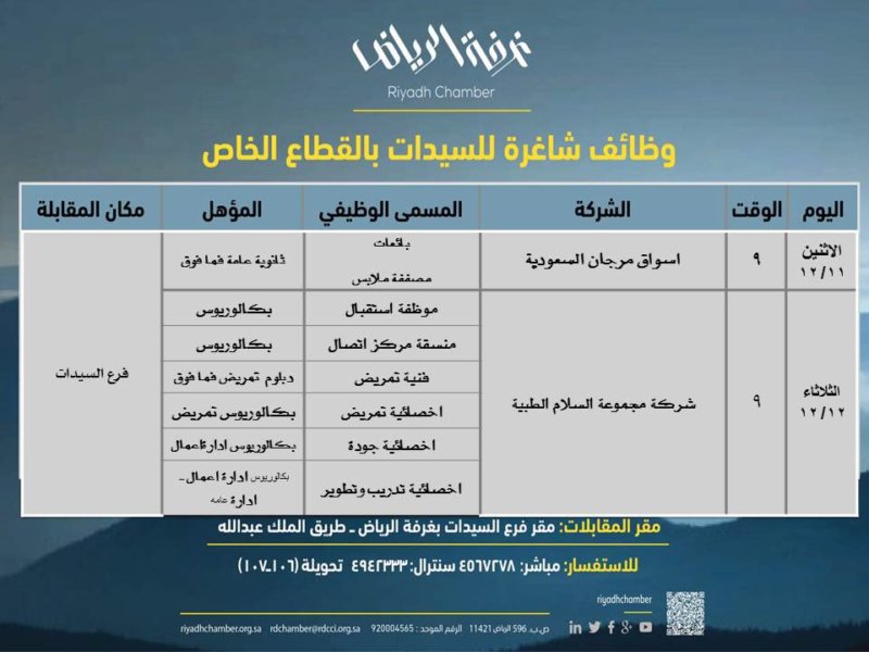 للتقديم على الوظائف هذه من خلال فرع غرفة الرياض في في طريق الملك عبدالله القسم النسائي.