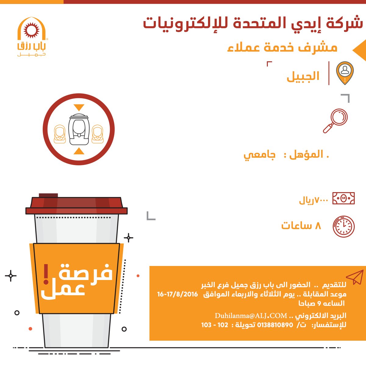 شركة ايدي المتحدة مشرف خدمة عملاء في #الجبيل راتب 7000 ريال وبائعين وامين صندوق