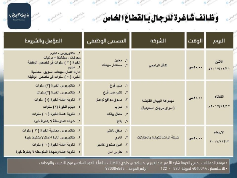 اعلنت غرفة الرياض عن توفر وظائف منوعه في ثلاث شركات وهي تكافل الراجحي – مجموعة الهبدان القابضة (أسواق المرجان السعودية) – شركة الراشد لتجارة والمقاولات”