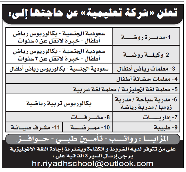 وظائف مديرة روضة ووكيلة ومعلمات وإداريات ومشرفات وتمريض في #الرياض