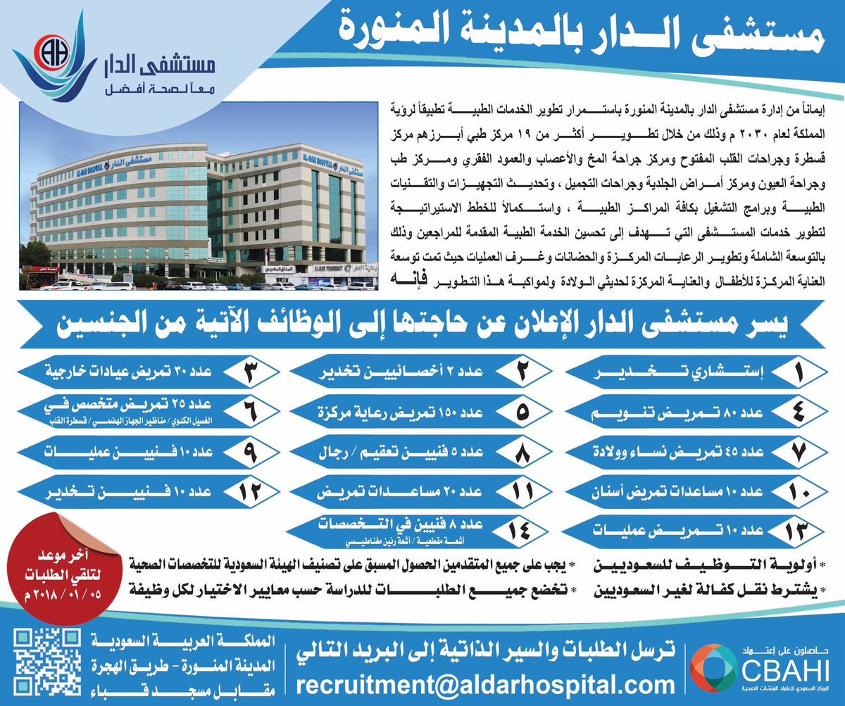 مستشفى الدار في المدينة وظائف صحية نسائية ورجالية