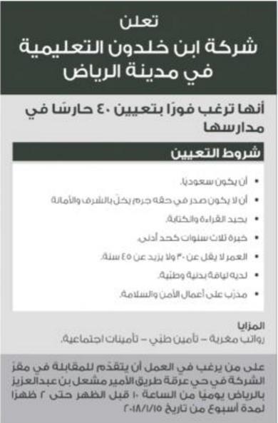 شركة ابن خلدون التعليمية وظائف حراس امن في الرياض