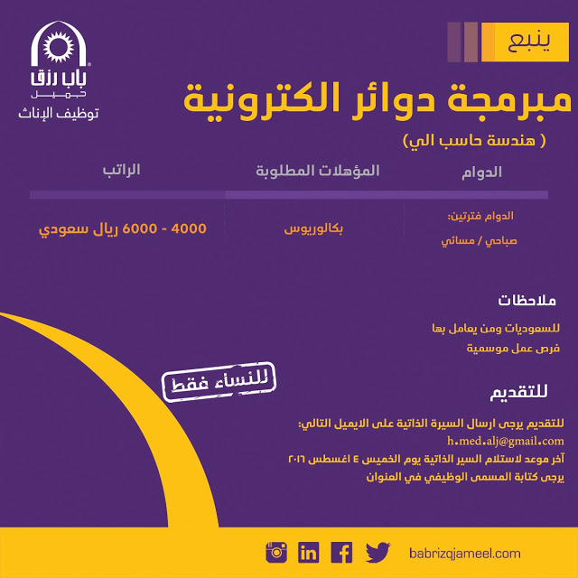 وظيفة في #ينبع مدرةب اوردينو ومبرمجة راتب حتى 6000 ريال