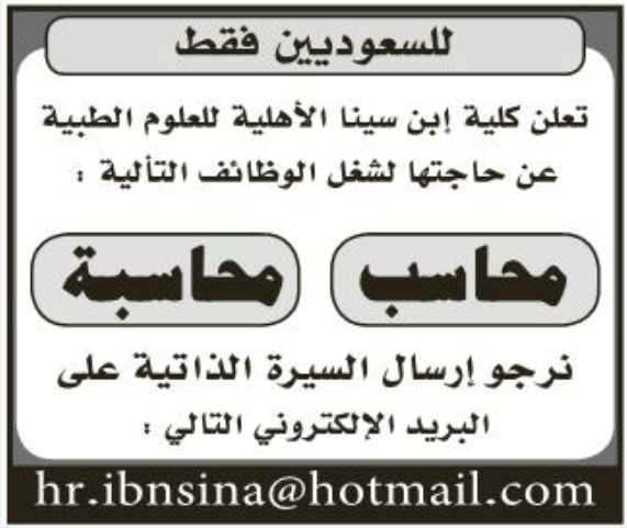 كلية ابن سيناء وظائف محاسب ومحاسبة