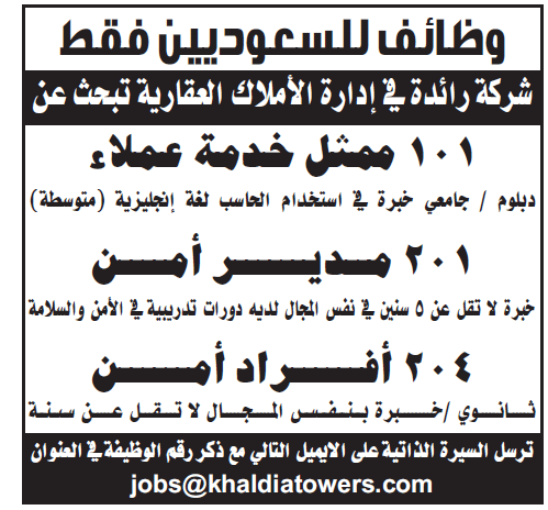 وظائف في شركة عقارية خدمة عملاء ومدير امن وموظفي أمن في #الرياض