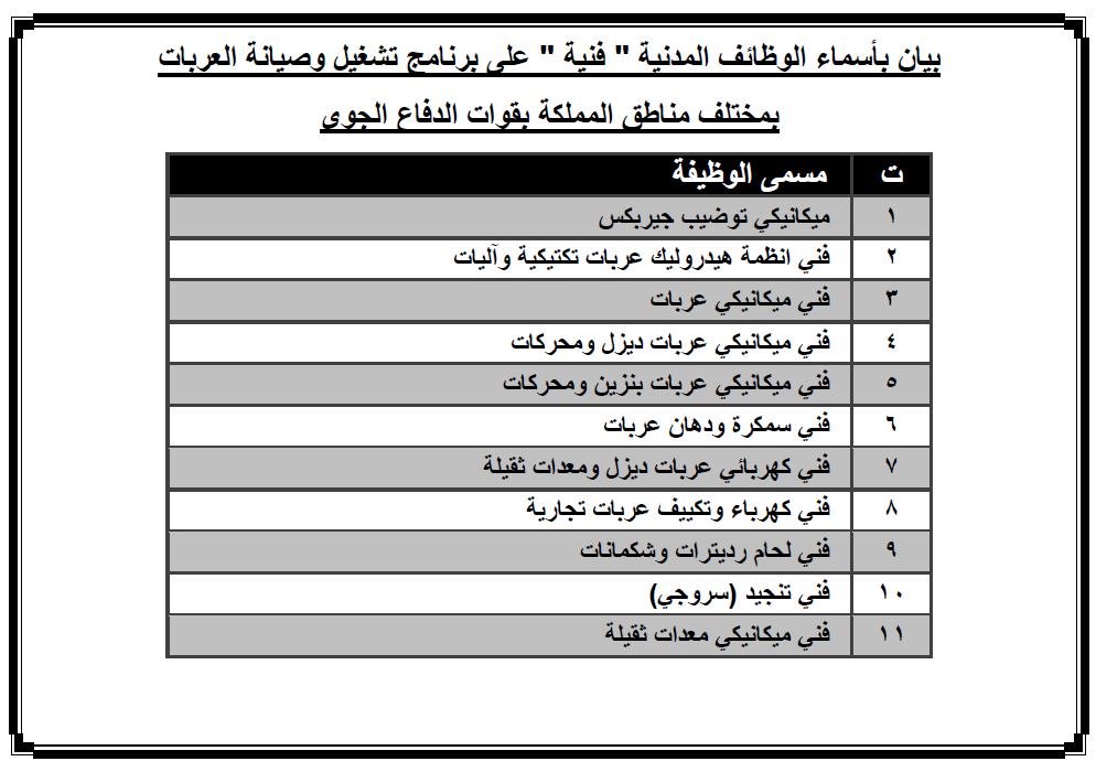 تعلن قوات الدفاع الجوي الملكي السعودي عن توفر عدد من الوظائف المدنية ” فنية ” على برنامج تشغيل وصيانة العربات