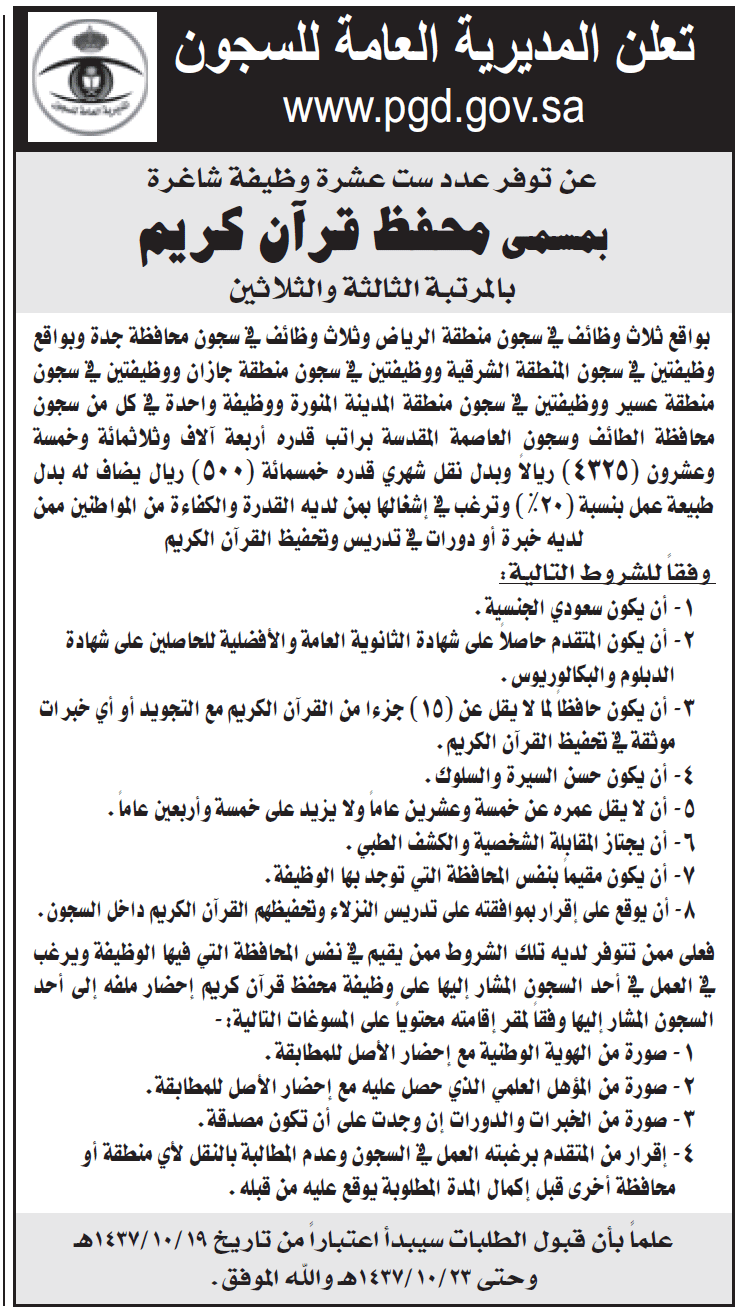 المديرية العامة للسجون وظائف محظفي قرآن في #الرياض #جدة #عسير #جازان #المدينة والشرقية