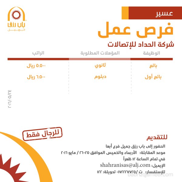 شركة الحداد للإتصالات وظائف في #عسير بائعين رواتب حتى 6500 ريال
