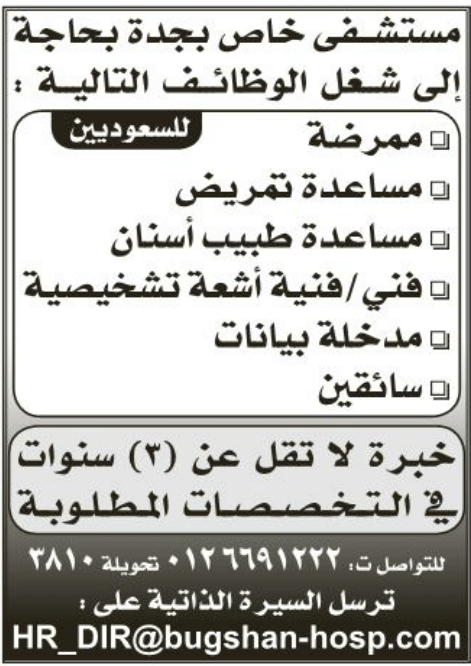 وظائف تمريض ومساعدي تمريض وفنيين اشعة ومدخلة بيانات وسائقين في مستشفى في #جدة