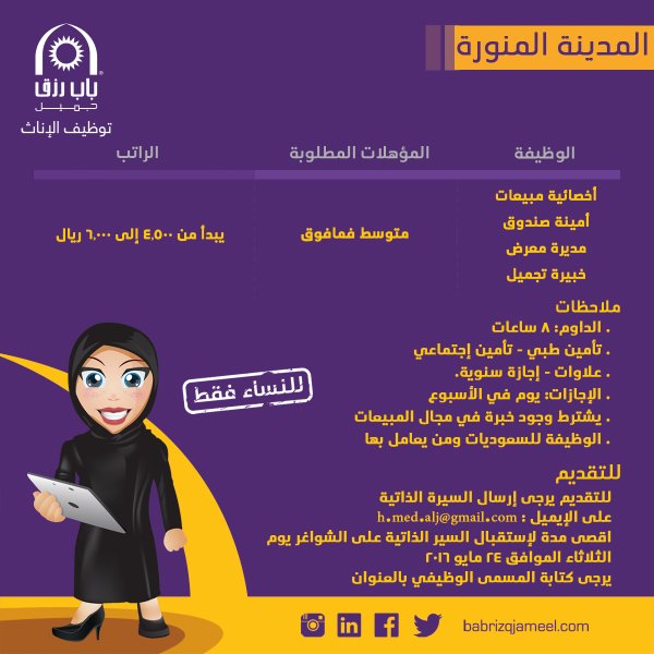 23/05/2016 | أحدث الوظائف اليوم، وظائف المدينة المنورة، وظائف نسائية