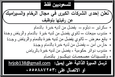 وظائف في #الدمام سكرتير ومندوب مبيعات وبائع وحارس أمن ومعقب