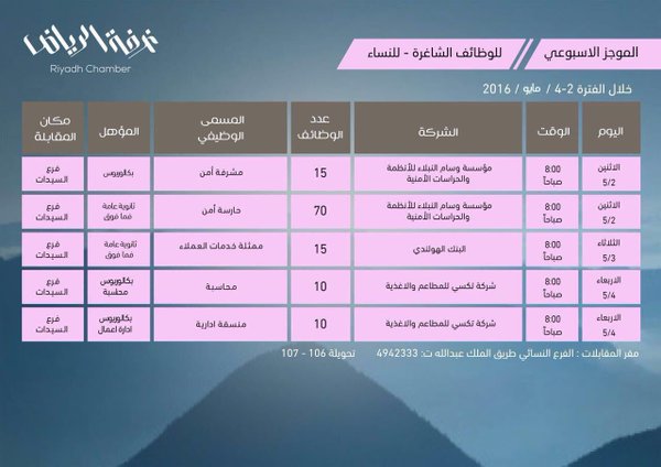 أما بالنسبة لوظائف السيدات فإنها ستبدأ في يوم الاثنين 3/مايو ، حيث سيتم إجراء المقابلات الشخصية للشابات الحاصلات على البكالوريوس لشغل 15 وظيفة تحت مسمى مشرفة أمن، إضافة إلى 70 وظيفة تحت مسمى حارسة أمن مخصصة للحاصلات على الثانوية العامة وما فوق وذلك للعمل في مؤسسة وسام النبلاء للأنظمة والحراسات الأمنية، علماً أن المقابلات ستكون بمقر فرع سيدات غرفة الرياض الثامنة صباحاً.