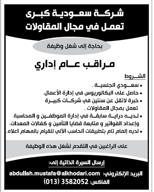 وظيفة مراقب إداري في شركة مقاولات في الشرقية لحملة بكالوريوس إدارة اعمال