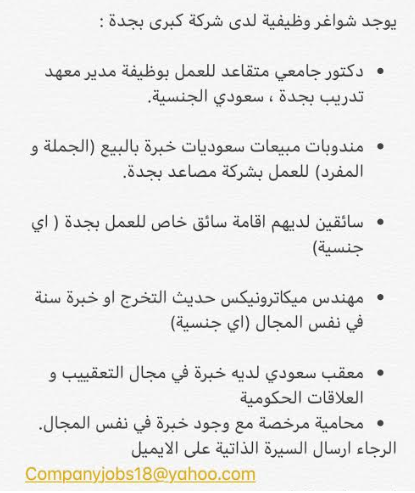 اعلنت شركة كبرى في جدة عن وظائف منوعه