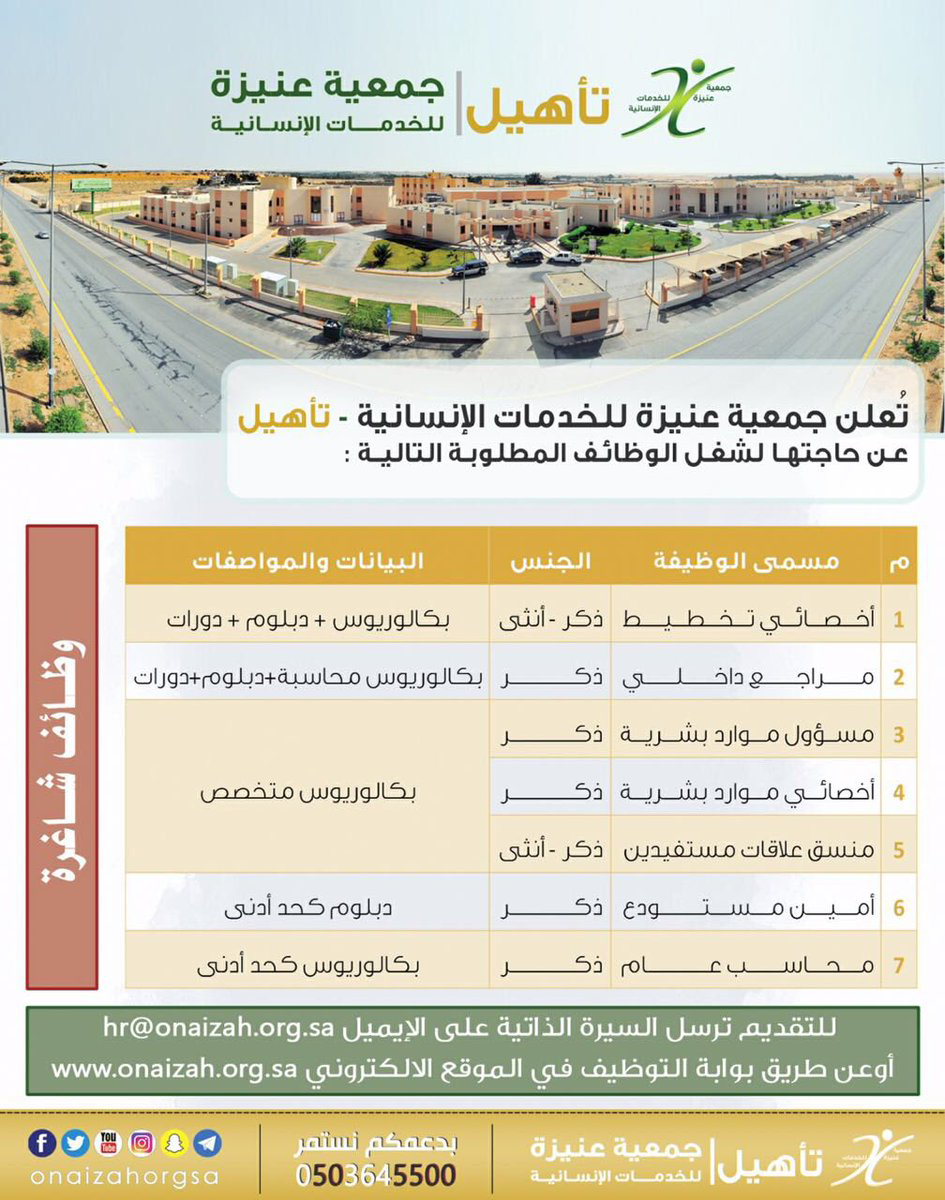 اعلنت جمعية عنيزة للخدمات الأنسانية تأهيل عن وظائف نسائية ورجالية