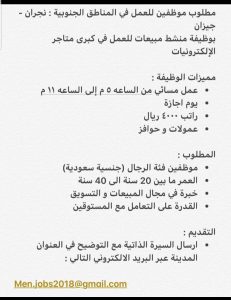 وذلك للعمل في وظيفة منشط مبيعات في متاجر كبرى للالكترونيات