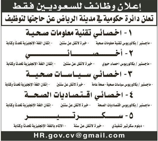 تعلن دائرة حكومية في الرياض عن حاجتها لتوظيف